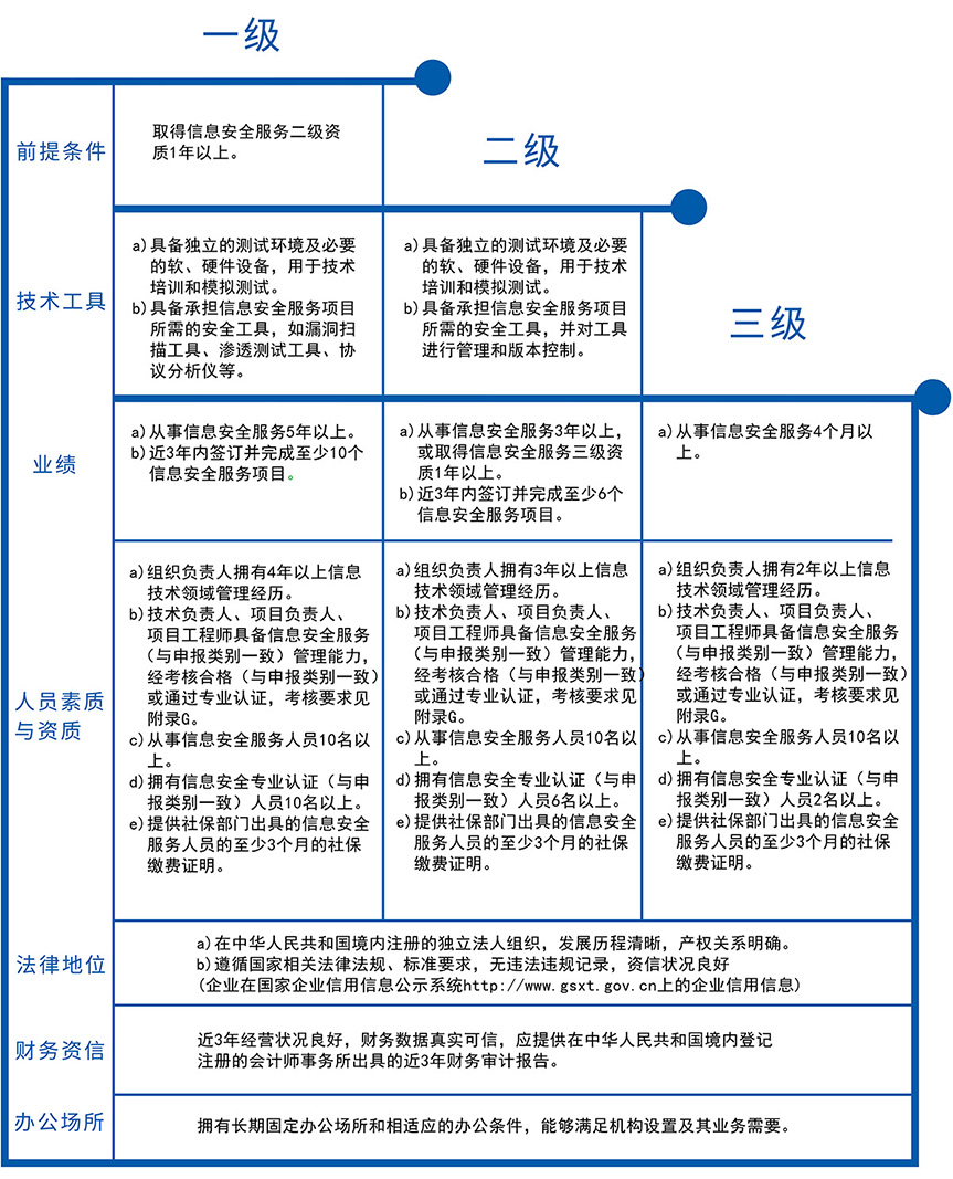 信息安全服務(wù)資質(zhì)是信息安全服務(wù)機(jī)構(gòu)提供安全服務(wù)的一種資格,包括法律地位、資源狀況、管理水平、技術(shù)能力等方面的要求。信息安全服務(wù)資質(zhì)認(rèn)證是依據(jù)國家法律法規(guī)、國家標(biāo)準(zhǔn)、行業(yè)標(biāo)準(zhǔn)和技術(shù)規(guī)范,按照認(rèn)證基本規(guī)范及認(rèn)證規(guī)則,對(duì)提供信息安全服務(wù)機(jī)構(gòu)的信息安全服務(wù)資質(zhì)進(jìn)行評(píng)價(jià)。